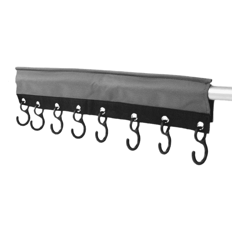 Deze Kapstok van Proplus bevestig je eenvoudig met klittenband aan een tentstok of aan een rail van de caravan. In een handomdraai heb je 8 haakjes om je jassen aan op te hangen.