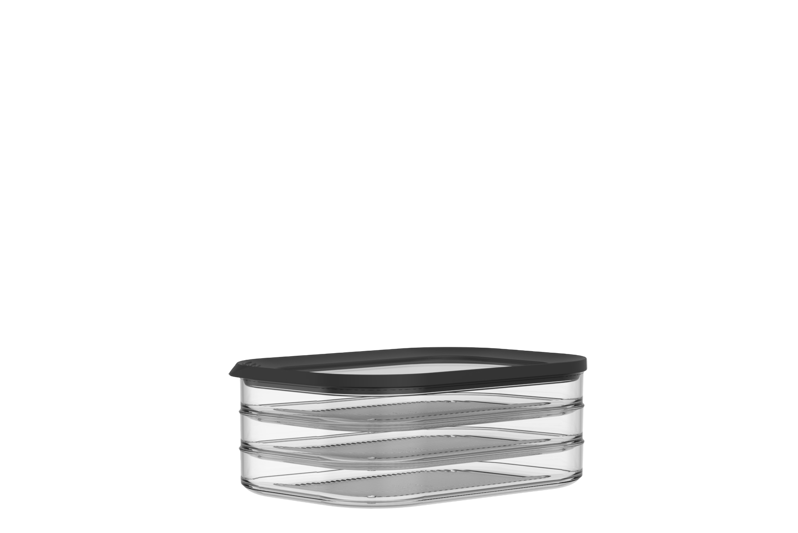 Vleeswarendoos Modula 550/3, voorzien van een doorzichtige deksel met zwarte ring. De rechthoekige Modula vleeswarendoos met afgeronde hoeken heeft een inhoud van 1650 ml en geeft direct zicht op inhoud, ook in de koelkast!